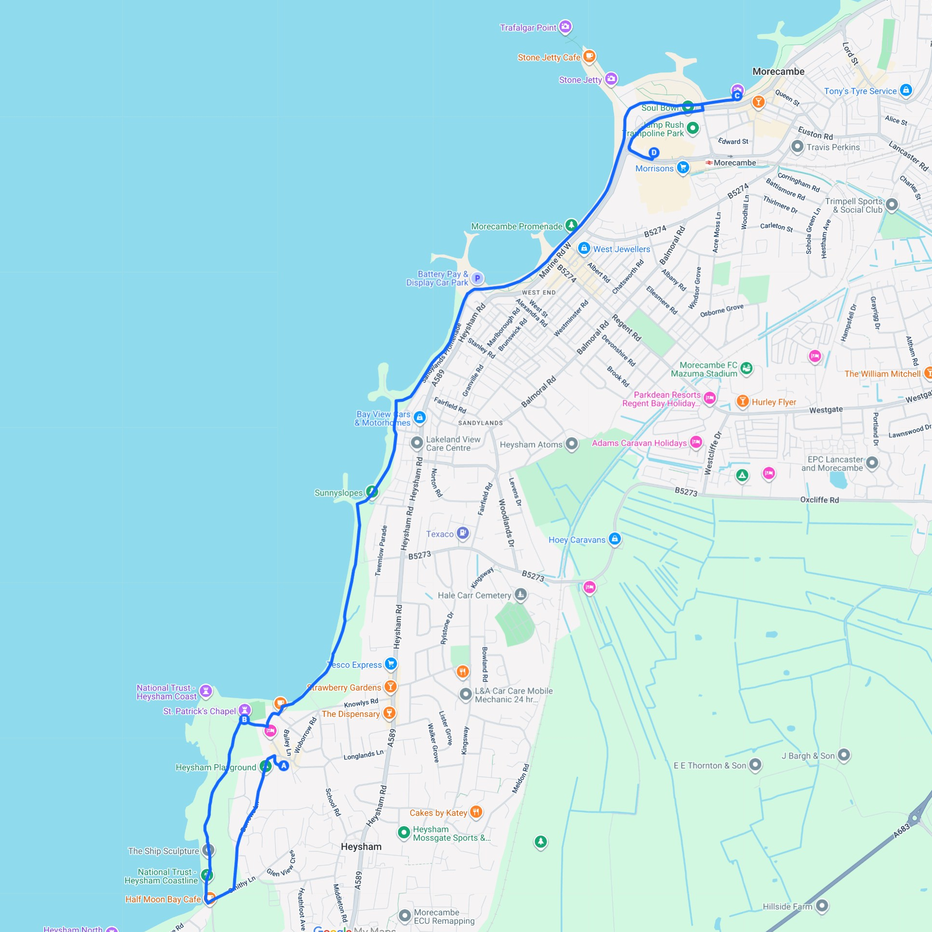 Minibuses will pick people up from Lancaster House Hotel at 13:00 and drop people off near the Heysham Playground. From there, people could either walk to the southern end of the Heysham Coastline and then proceed north or walk directly to St. Patrick's Chapel. From Heysham, people can then follow the coastline to Morecambe. Buses will pick up people at 17:00 from the Festival Market in Morecambe.